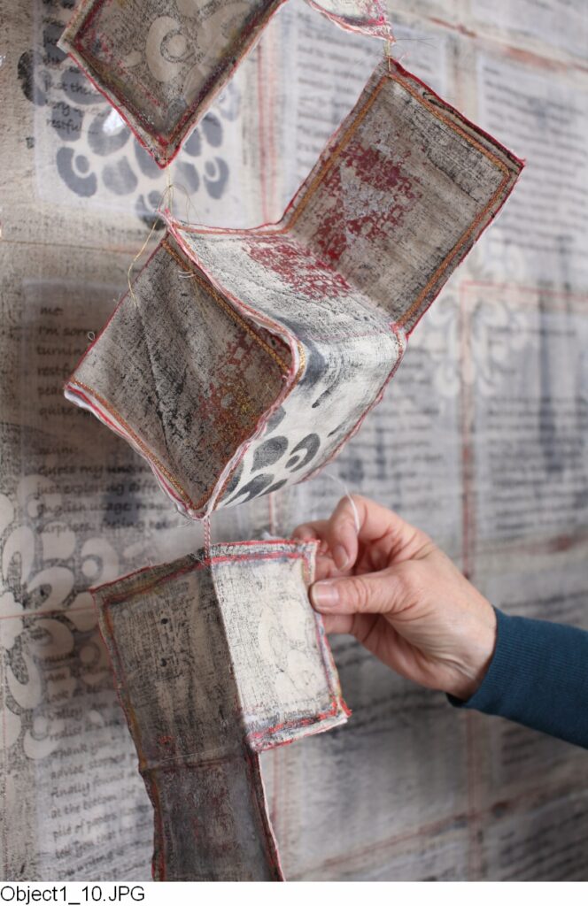Hanging slightly in front, at both sides and piled below, are a number of 3D textile boxes, referring back to those original ones I made in Beijing which sparked off the dialogue.
